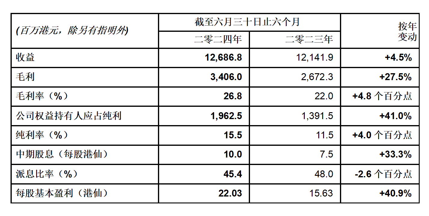 于二零二四年上半年,集團綜合收益同比上升4.5%至12,686.8百萬港元。毛利上升27.5%至3,406.0百萬港元,毛利率亦有所改善,由二零二三年上半年的22.0%增至26.8%。與此同時,公司權益持有人應占溢利大幅增加41.0%至1,962.5百萬港元。