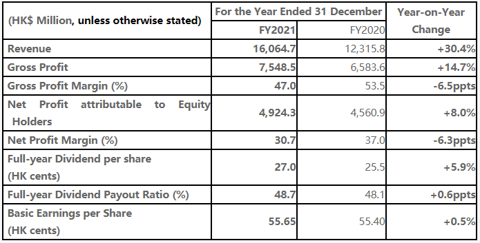 Asof 31 December 2021, the Group maintained a healthy financial position, withcash and cash equivalents at HK$7,458.3 million (31 December 2020: HK$9,291.2million). The Board of Directors proposed the payment of a final dividend of 10.0HK cents per share (FY2020: 17.0 HK cents). The dividend payout ratio for theYear was 48.7% (FY2020: 48.1%).