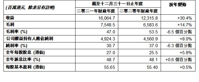 截至二零二一年十二月三十一日,集團(tuán)的財(cái)務(wù)狀況維持穩(wěn)健,現(xiàn)金及現(xiàn)金等價(jià)物總額為7,458.3百萬港元(二零二零年十二月三十一日:9,291.2百萬港元)。董事會建議派付末期股息每股10.0港仙(二零二零年財(cái)政年度:17.0港仙)。全年的派息比率為48.7%(二零二零年財(cái)政年度:48.1%)。